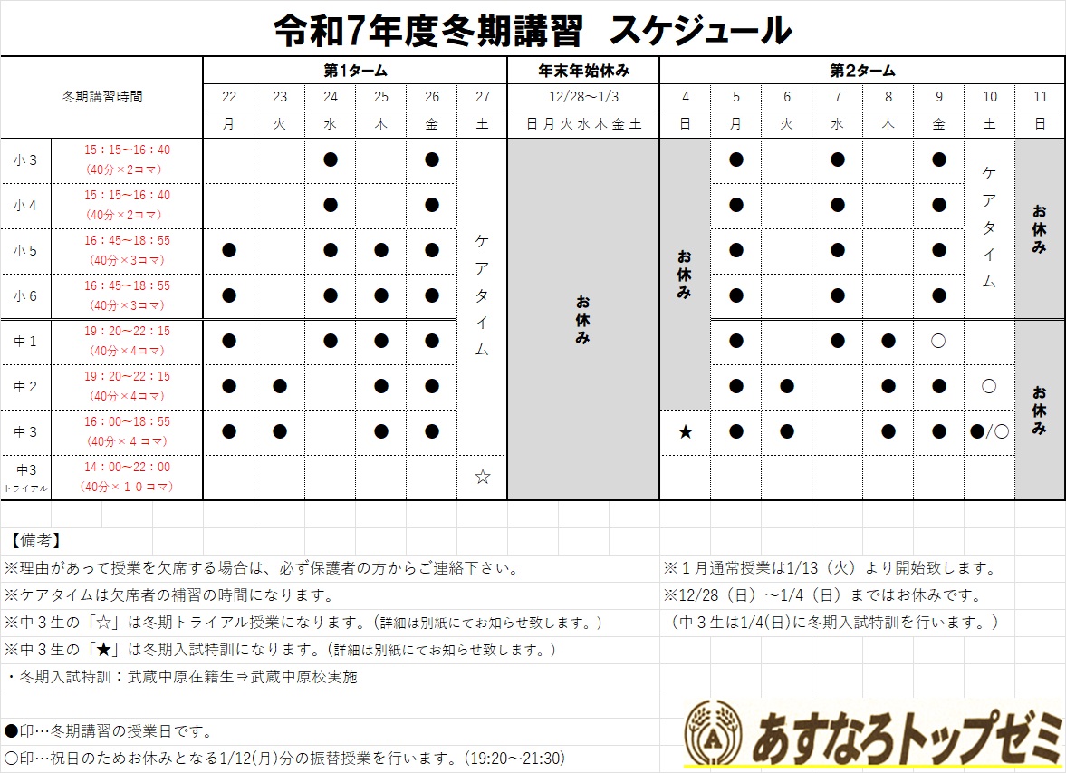 2025.12.16 冬期講習 お知らせ 武蔵中原校 こんにちは。 武蔵中原校の角田です。 冬期講習のスケジュールを掲載いたします。 ☆校舎からのお知らせ あすなろトップゼミ武蔵中原校では長期無料体験を実施しております。 「冬期講習+1月通常授業」 上記の期間で無料体験授業を実施しておりますので、 ご興味がございましたら校舎までお問い合わせください。 あすなろトップゼミ武蔵中原校 TEL:044-755-0199 前の記事 記事一覧 次の記事