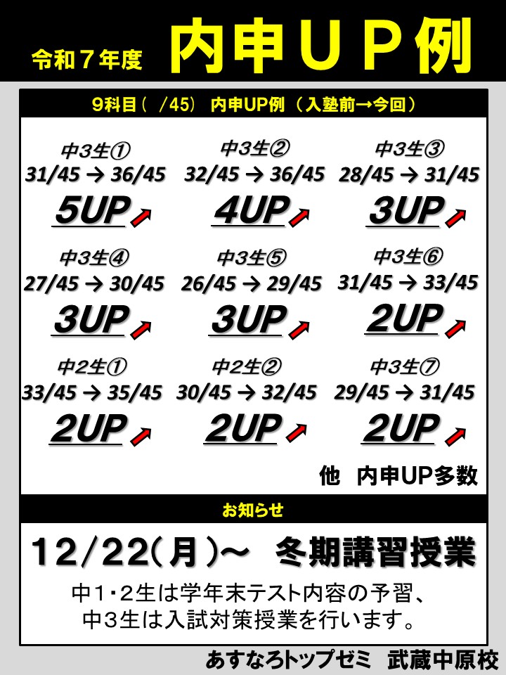 武蔵中原校、今年度の内申アップ例を数名、ご紹介いたします。